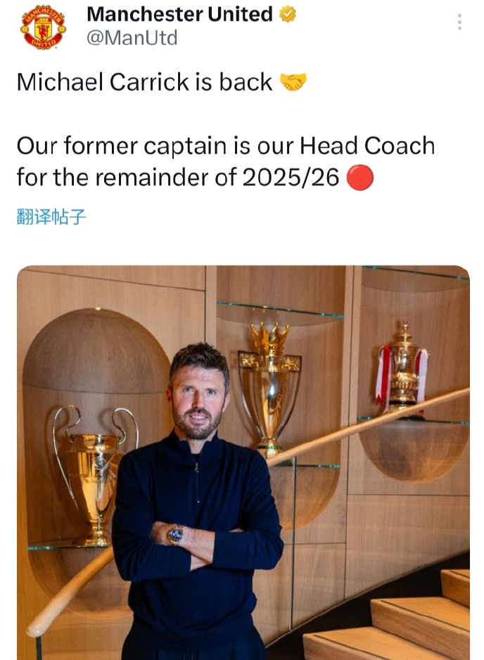 在重掌曼联帅印后,卡里克也第一时间发声:“能够肩负起领导曼联的重任是一种荣幸。本赛季我们仍有很多目标需要争取,我们已经准备好团结一致,为球迷们奉献他们忠实支持应得的精彩表现。”